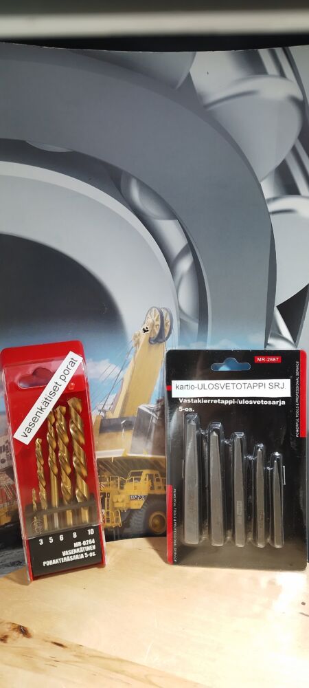 ikuinen ongelma, katkenneet pultit, nyt korjataan: VASENKÄTISELLÄ COBOLT METALLIPORALLA PORATAAN PULTIN PÄÄHÄN REIKÄ(pultti voi jo tässä vaiheessa aueta), KUN REIKÄ ON PORATTU PULTIN PÄÄHÄN, SEN JÄLKEEN LYÖDÄÄN KARTIOMALLINEN VASTAKIERRETAPPI REIKÄÄN JA VÄÄNNETÄÄN KIINTOLENKILLÄ AUKI,(jos tässä vaiheessa katiotappikin katkeaa niin sen saa vielä helposti pois kartiokkuuden takia), porat 3mm, 5mm, 6mm, 8mm, 10mm vasenkätisinä sarjassa, kartiotappeja myös 5 erikokoa sarjassa, koko paketin hinta 48.00 netto verolla